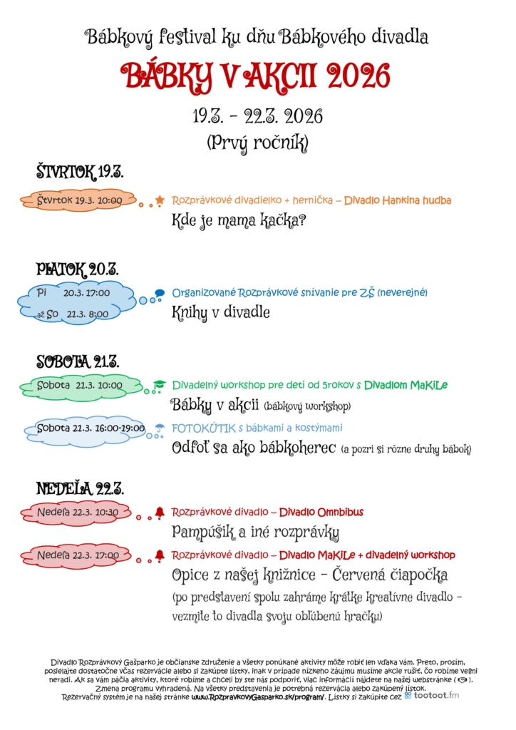 Pri príležitosti Dňa bábkového divadla (21.3.) sme pripravili pre vás prvý ročník bábkového festivalu BÁBKY V AKCII. V ponuke budú workshopy pre deti, rozprávkové divadlá i divadielka. A to všetko s 50% zľavou na vstupné!!!